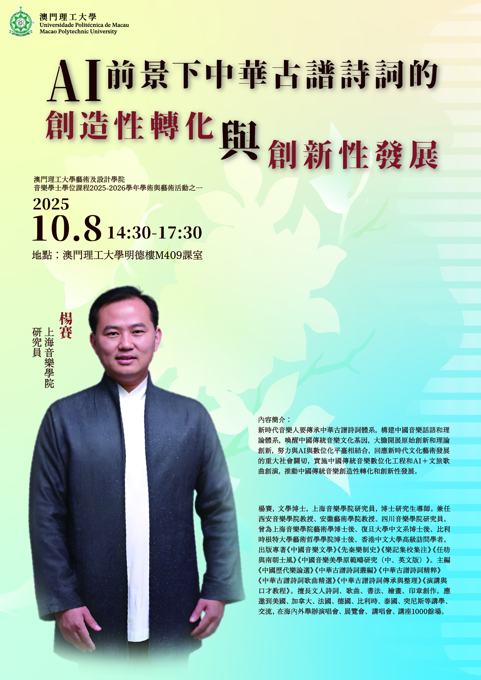 新時代音樂人要傳承中華古譜詩詞體系,構建中國音樂話語和理論體系,喚醒中國傳統音樂文化基因,大膽開展原始創新和理論創新,努力與AI與數位化平臺相結合,回應新時代文化藝術發展的重大社會關切,實施中國傳統音樂數位化工程和AI+文旅歌曲創演,推動中國傳統音樂創造性轉化和創新性發展。