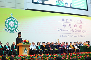 Meanwhile, the SAR government fully embraces MPI’s endeavors to capitalize on its unique features and leverage its competitive advantage, as well as its proactive initiatives, by inviting local and overseas education quality assurance agencies to conduct academic accreditation reviews. It applauds MPI’s timely adoption of effective measures that fulfill its three social functions of enhancing teaching and research as well as serving the community, thus making its unique contributions to deepening the utilization of Macao’s human resources and broadening its talents pool. The Chief Executive ended his speech by calling upon MPI graduates to put what they have learned from MPI into practice, and to make contributions to Macao as a means to realize their ultimate dreams in life.