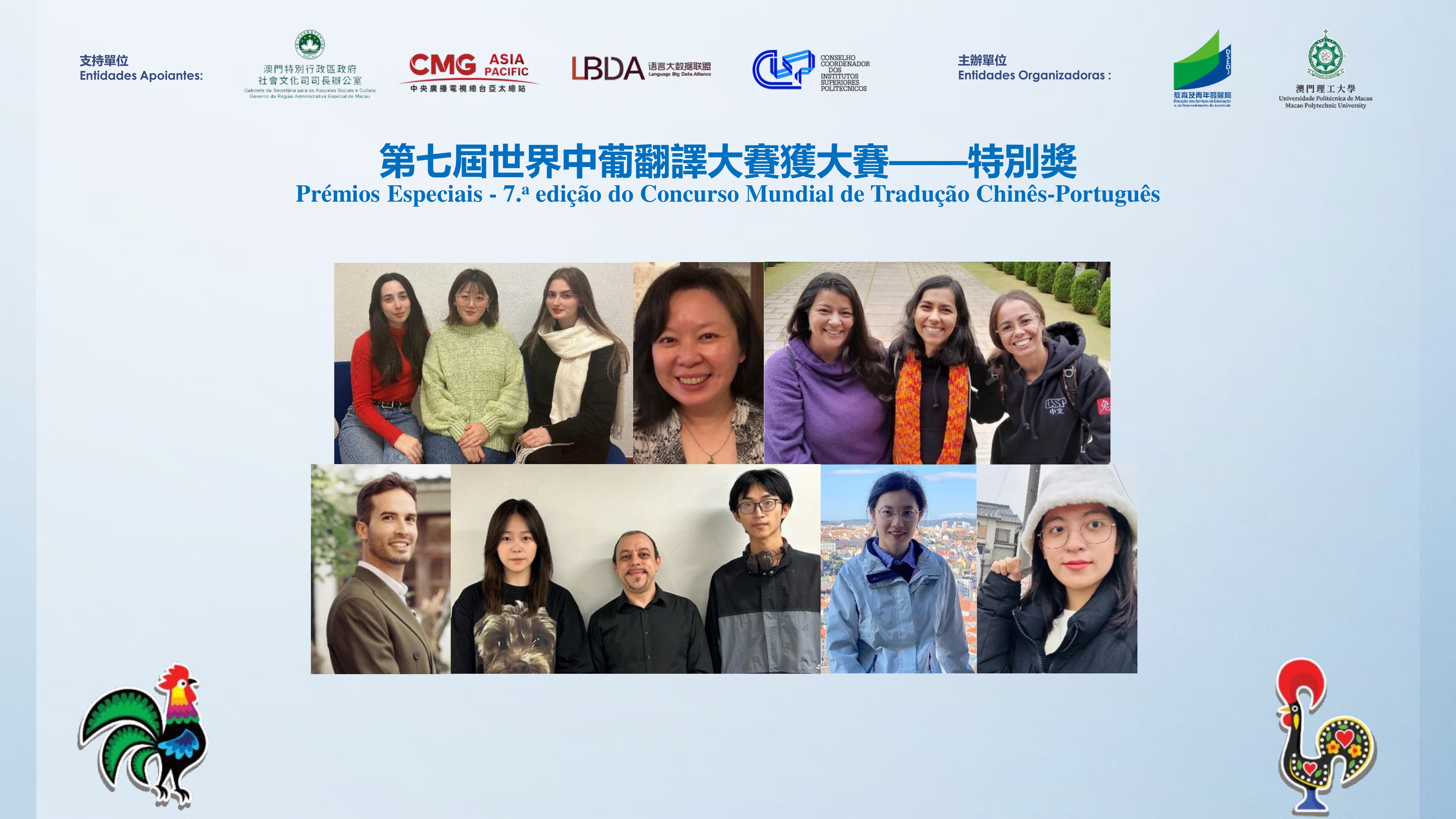 Equipas vencedoras dos “Prémios especiais para as equipas das instituições de ensino superior da Grande Baía Guangdong-Hong Kong-Macau” e “Prémios especiais para as equipas das instituições de ensino superior dos Países de Língua Portuguesa” da 7.ª Edição do Concurso Mundial de Tradução Chinês-PortuguêsCom vista a reforçar ainda mais o papel de Macau como “Plataforma entre a China e os Países de Língua Portuguesa” e a construção da “Base de intercâmbio e cooperação que, tendo a cultura chinesa como predominante, promova a coexistência de diversas culturas”, bem como elevar a influência internacional de Macau, foi realizada com sucesso a 7.ª Edição do Concurso Mundial de Tradução Chinês-Português. O evento foi organizado pela Direcção dos Serviços de Educação e de Desenvolvimento da Juventude e pela Universidade Politécnica de Macau, e apoiada pelo Gabinete da Secretária para os Assuntos Sociais e Cultura do governo da RAEM, pela China Media Group Asia-Pacific Headquarters, pela Language Big Data Alliance (LBDA) e pelo Conselho Coordenador dos Institutos Superiores Politécnicos (CCISP). A edição deste ano contou com a entusiástica participação de mais de 100 equipas provenientes de mais de 40 instituições de ensino superior do Interior da China, de Macau e dos Países de Língua Portuguesa.