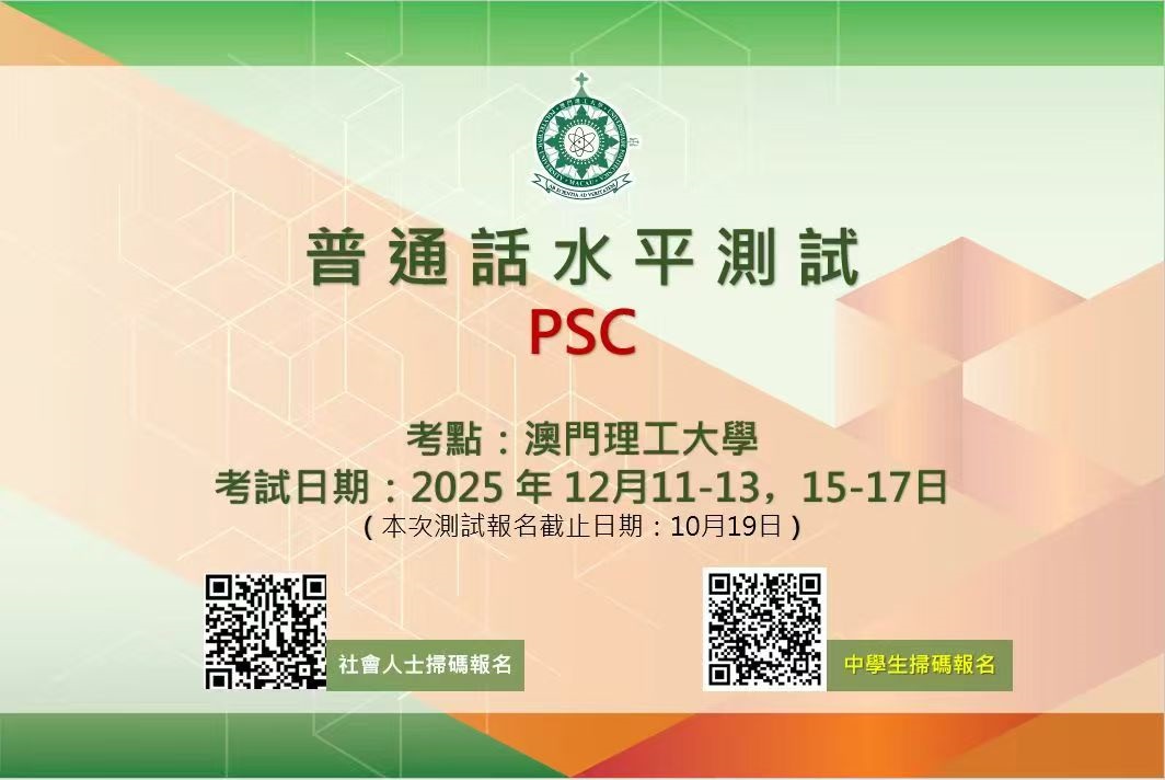 A Universidade Politécnica de Macau (UPM), em colaboração com a Comissão Estatal dos Trabalhos de Língua, deu início aos trabalhos de inscrição para o Teste de Proficiência em Mandarim (PSC) a realizar em Dezembro de 2025. O teste está agendado para os dias 11 a 13, 15 a 17 de Dezembro. É bem-vinda a participação activa dos interessados de todos os sectores da sociedade, sendo o prazo de inscrição até 19 de Outubro.