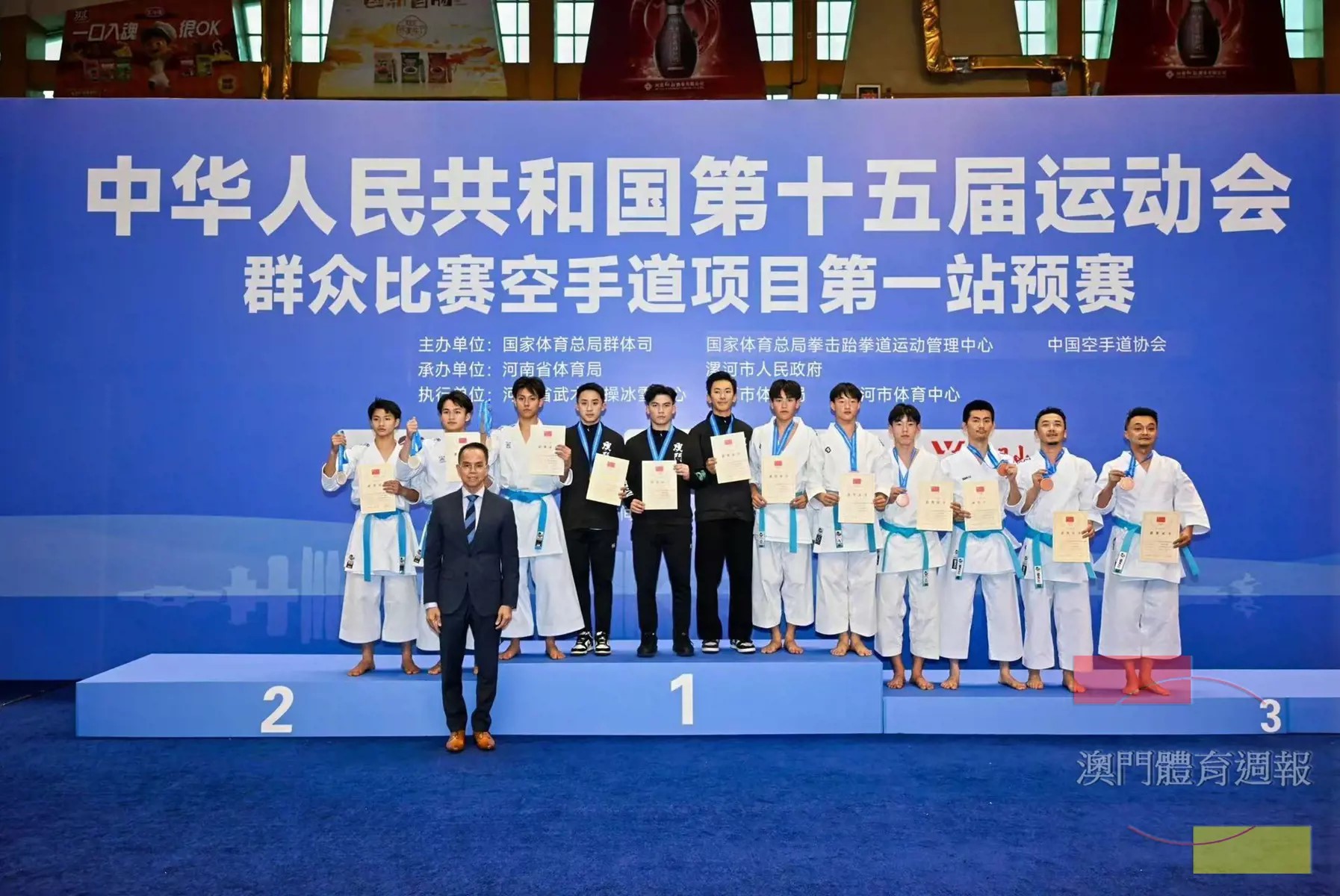 澳理大學生方文浩(左五)勇奪第十五屆全運會空手道男子團體賽事冠軍(圖片來源:澳門體育週報)