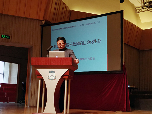 作為論壇創辦人之一以及資深音樂教育學者,澳門理工學院藝術高等學校音樂課程主任代百生副教授在主席台就坐,並作主題發言《關注學校音樂教師的社會化生存》。發言分為三個部份:從教育社會學角度考察學校教師“職業”的社會生存狀況,以此作為理論基礎;特別關注與分析了作為學校教師的“小眾群體”的音樂教師“社會化生存”的尷尬狀況;在最後重點提出了破解學校音樂教師社會生存壓力與困境的若干建議,在其中特別介紹了澳門理工學院音樂課程在改革與發展中的舉措,包括聘請國際學術權威作為“校外考試委員”協助審核教學大綱與考試資料,嚴把教學學術質量關;成立“校外咨詢委員會”及時了解社會對音樂人才的能力需求,為課程改革與教學調整搜集信息;建立畢業系友資料庫跟蹤了解畢業生工作狀況並及時介紹學院動態,並樹立對畢業生的“產品跟蹤服務意識”;倡導“為教而學勝過為學而學”的教與學新觀念等。發言總結到:“以社會平等”這一社會學學科之眼來審視教育,所看到的便是影響著教育、發生在教育過程及受制于教育的各種各樣的平等問題。學校音樂教師這一職業群體在學校教育工作中已經或正在經歷著一些“不平等”,急需依靠教育制度保障、學校文化建設以及音樂教師本身的心理調適來加以改進。學校音樂教師的“社會地位”與“教育權威”從何而來又殘存幾許?其“作為教師的人”與“作為人的教師”的雙重角色轉換是否順利?其職業社會化前景如何等等這些問題是影響學校音樂教師工作成效的重要因素與深層動機,需要引起教育管理者、音樂教育研究者、學校音樂教師從業者乃至全社會的關注。代百生副教授的主題發言引起參會的各級學校音樂教師的共鳴,討論熱烈。