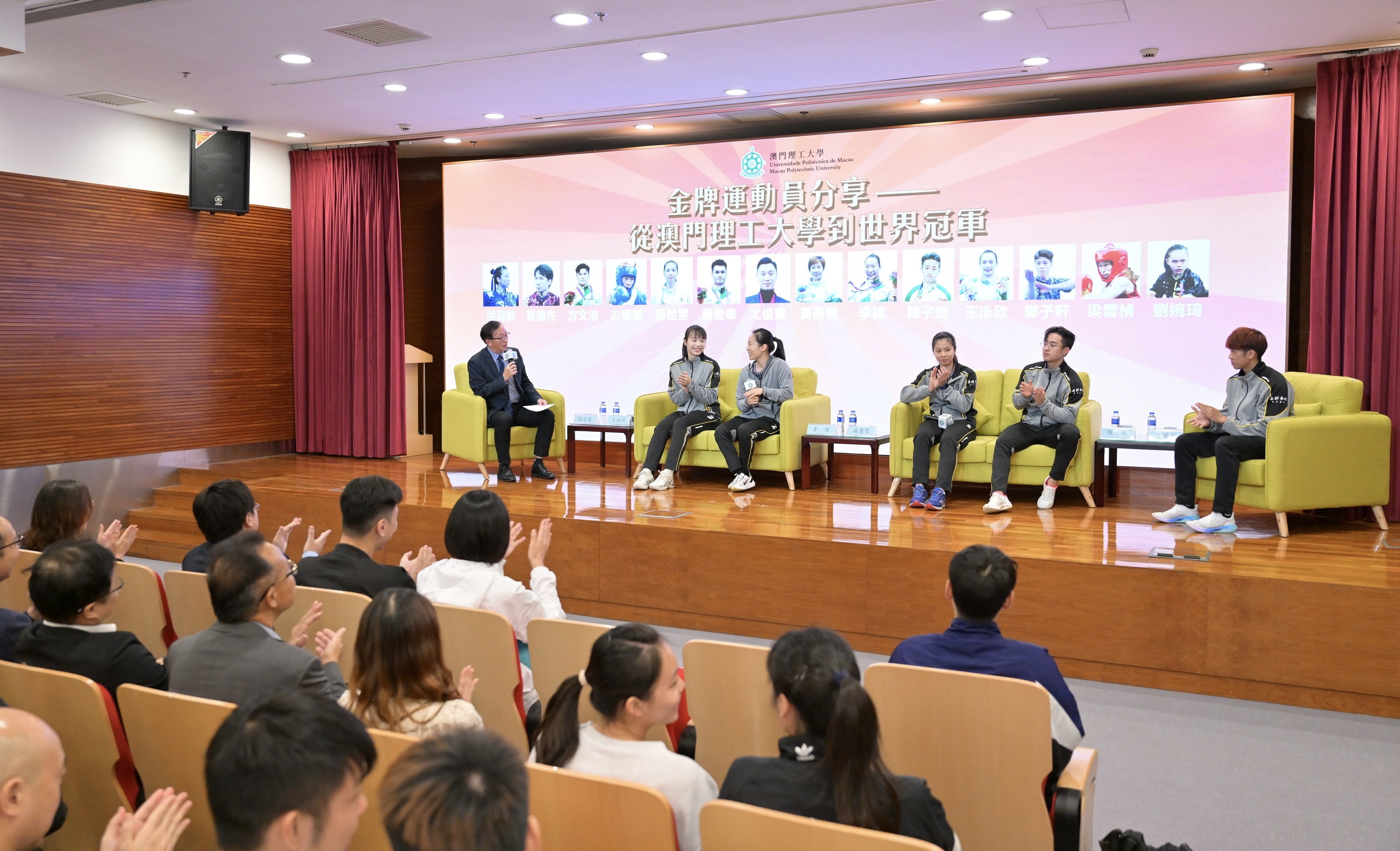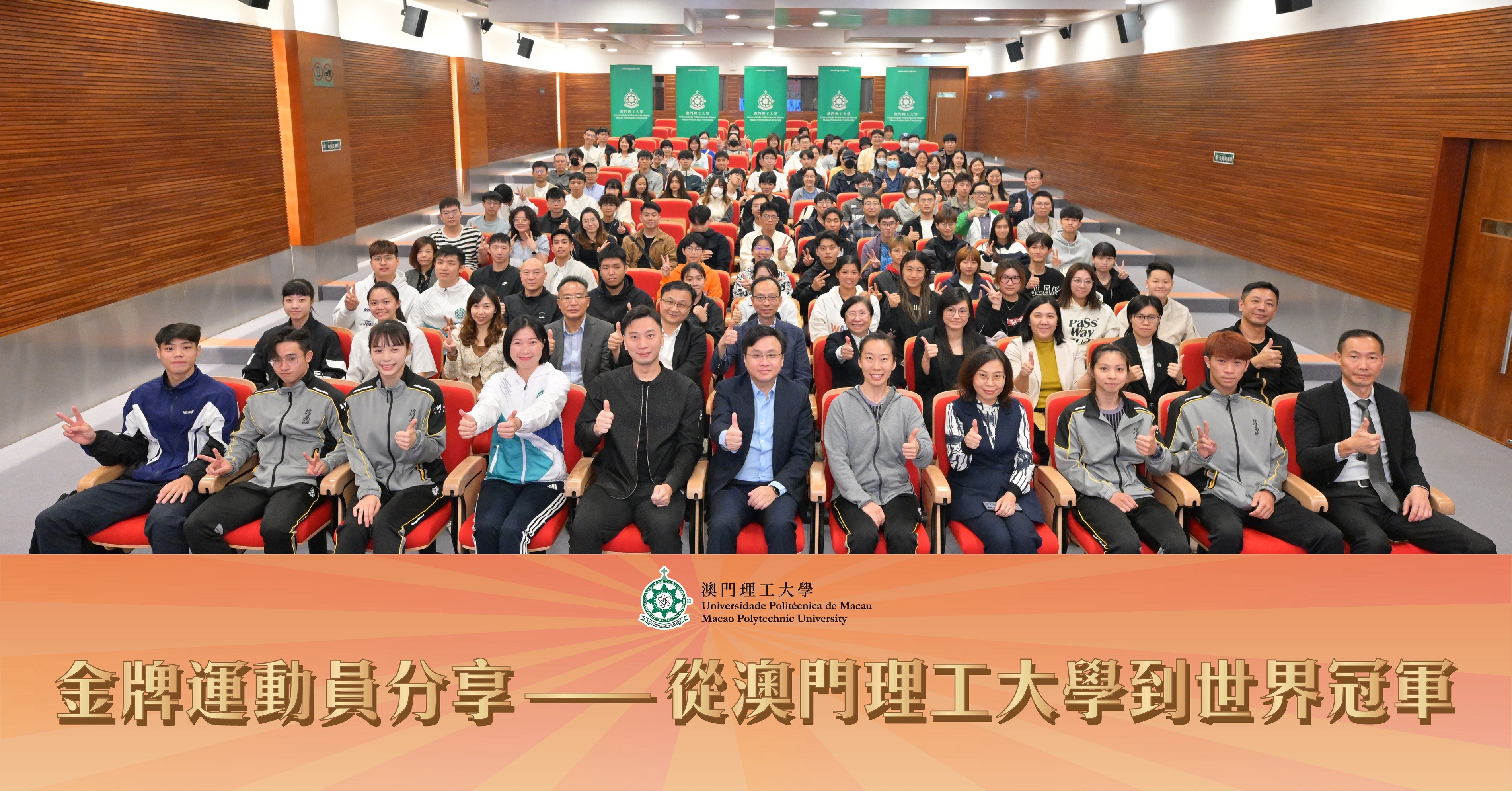 澳門理工大學於11月29日在匯智樓演講廳舉行 “金牌運動員分享──從澳門理工大學到世界冠軍”分享會,匯聚眾多亞洲運動會、世界大學生運動會、全國學生運動會、世界武術錦標賽等國際賽事金牌學生及畢業生,分享他們追夢之路。活動吸引近二百名澳理大師生參與,場面歡欣愉快,交流氣氛熱烈。