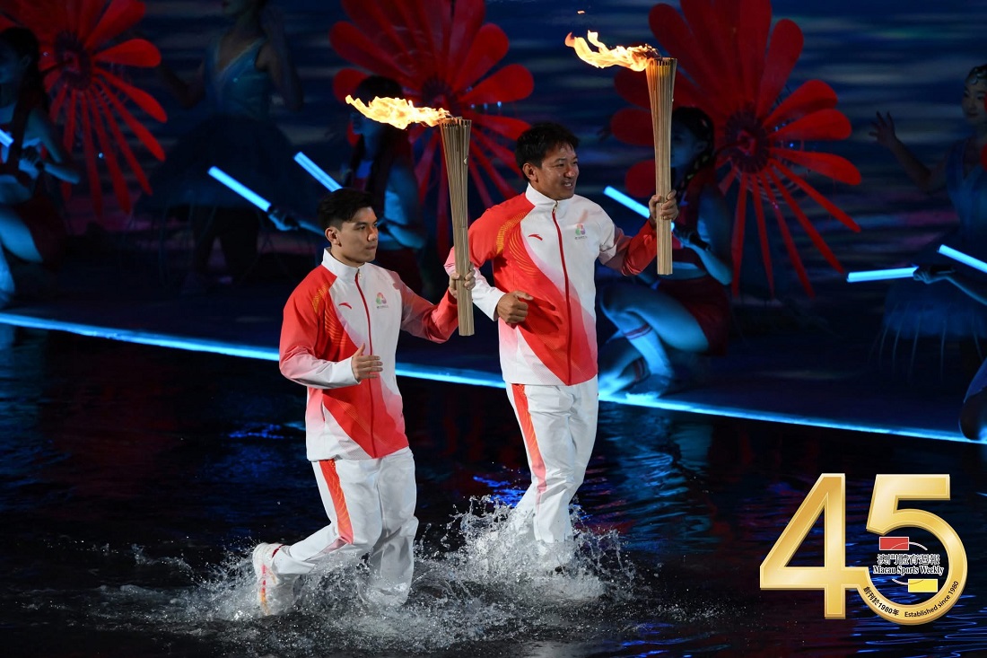 十五運會澳門首面金牌得主(空手道男子團體型金牌)、澳門理工大學體育教育學士課程學生方文浩,於開幕儀式上擔任火炬手,先在場內進行火炬傳遞,再由澳門首位亞運會女子金牌得主(女子長拳金牌)、澳門理工大學運動及體育碩士學位課程畢業生李禕,與男子 100米亞洲紀錄保持者蘇炳添和奧運會男子花劍金牌得主香港運動員張家朗,粵港澳三地運動員代表共同點燃主火炬。