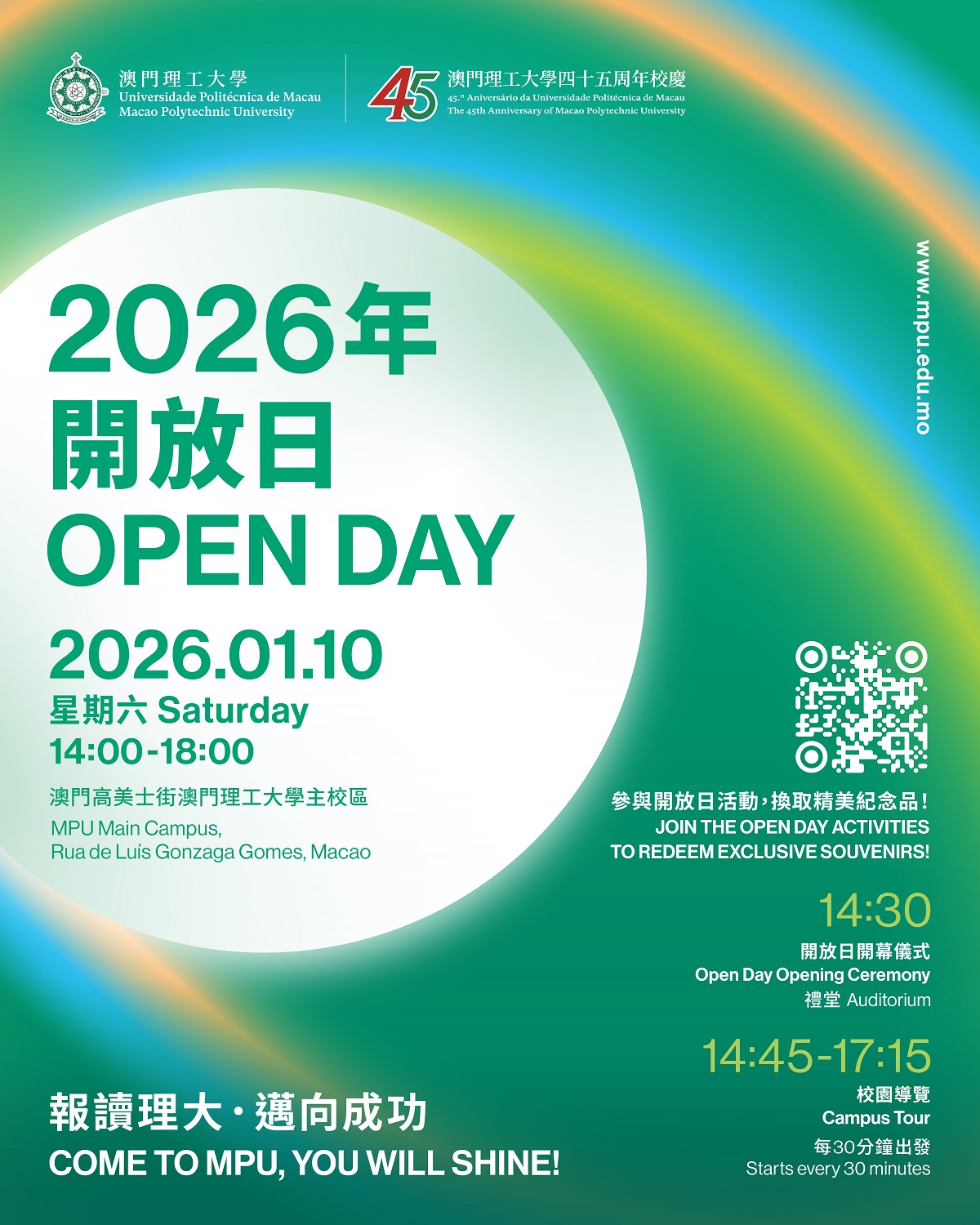為喜迎澳門理工大學45周年校慶,澳門理工大學2026年開放日將於1月10日(星期六)於澳門高美士街澳理大主校區舉行。本年度開放日以“科創與‘理’ 成就卓越”為題,透過學位課程講解會、專題展覽、工作坊、體驗活動、升學諮詢、校園導覽,以及線上線下訪談節目“與‘理’Chit-Chat”等活動精彩紛呈,向社會各界展示澳理大的辦學特色、課程資訊、教研成果、社會服務及國際合作成果,歡迎中學生、家長,以及社會各界蒞臨澳理大參與卓越教研體驗。