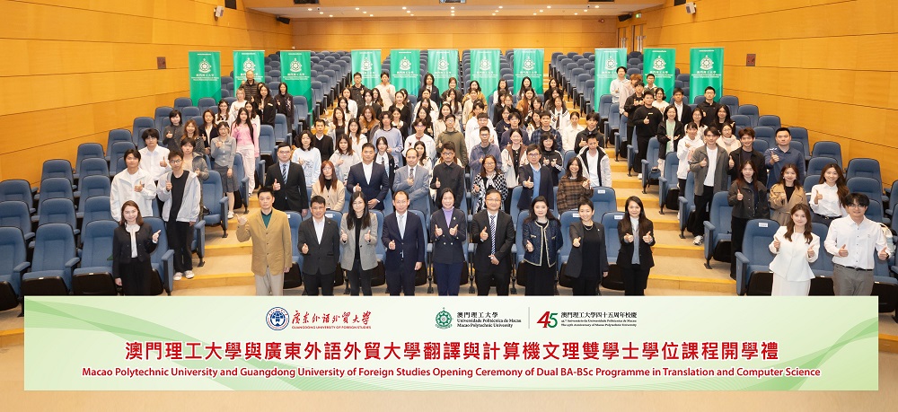 在《粵港澳大灣區發展規劃綱要》發佈七周年之際,澳門理工大學與廣東外語外貿大學合辦的“翻譯及計算機文理雙學士學位課程開學禮”在澳理大舉行,歡迎廣外—澳理大合作辦學項目首屆學生開啟澳門段學習新旅程。澳理大代校長李雁蓮、廣外副校長申明浩、兩校項目負責人,以及課程學生一百多人出席典禮,共同見證項目踏上新台階。