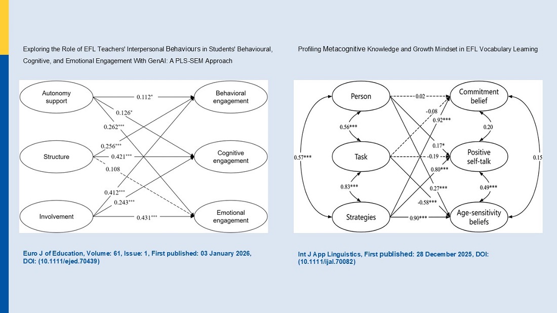 該研究團隊聚焦人工智能時代的教育變革。其中一項實證研究系統探討了生成式人工智能工具融入英語課堂後,教師自主支持、情感關懷等人際互動行為對學生多維學習投入的持續驅動作用,揭示了技術環境中師生情感聯結的不可替代性。另一研究則深入語言習得的心理認知層面,通過建模分析揭示了元認知知識與成長型思維模式對詞彙學習成效的協同促進機制。這兩項成果從教學實踐與學習心理雙重視角,為數智時代的語言教育創新提供了理論依據與實證支援。